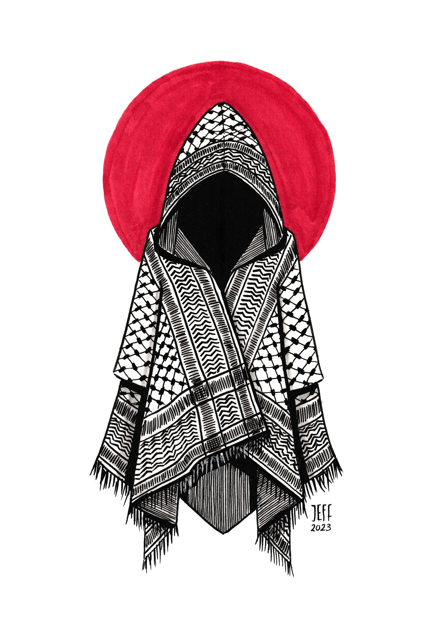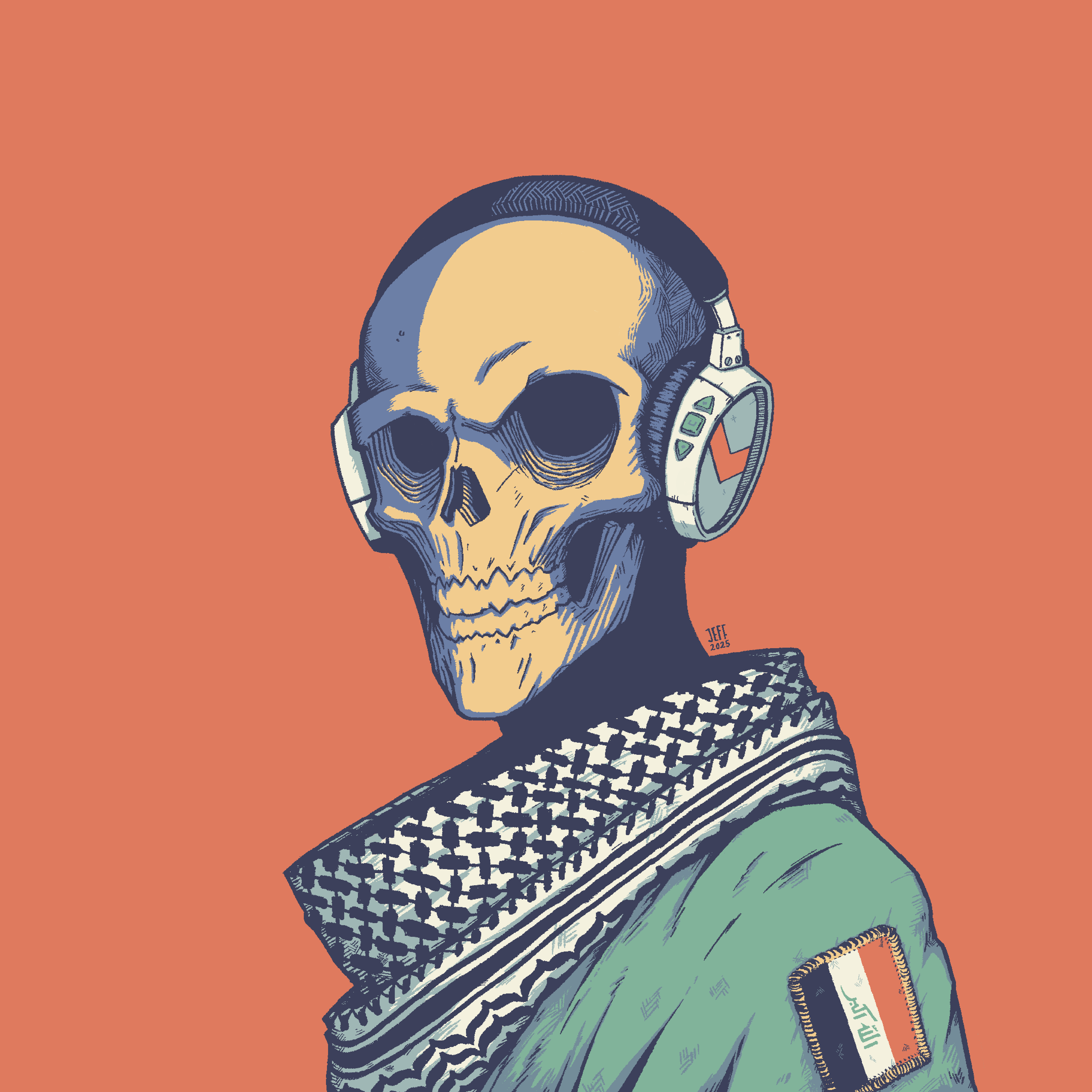Skull portrait - Digitally painted - Skulls are recurring elements in my art. They symbolize mortality (Memento mori) and the value of life. A skull also allows me to represent humanity in a way that ignores race or ethnicity. It can be a way to honour the dead and perhaps celebrate life. In this illustration I wanted to do a self-portrait without the focusing on my self and my face and instead focus on how I felt people see me for the past two years. Wearing a Keffiyeh everyday. Most interactions are actually pleasant and supportive but you do feel eyes looking up more often and its difficult to not feel self-conscious about it.