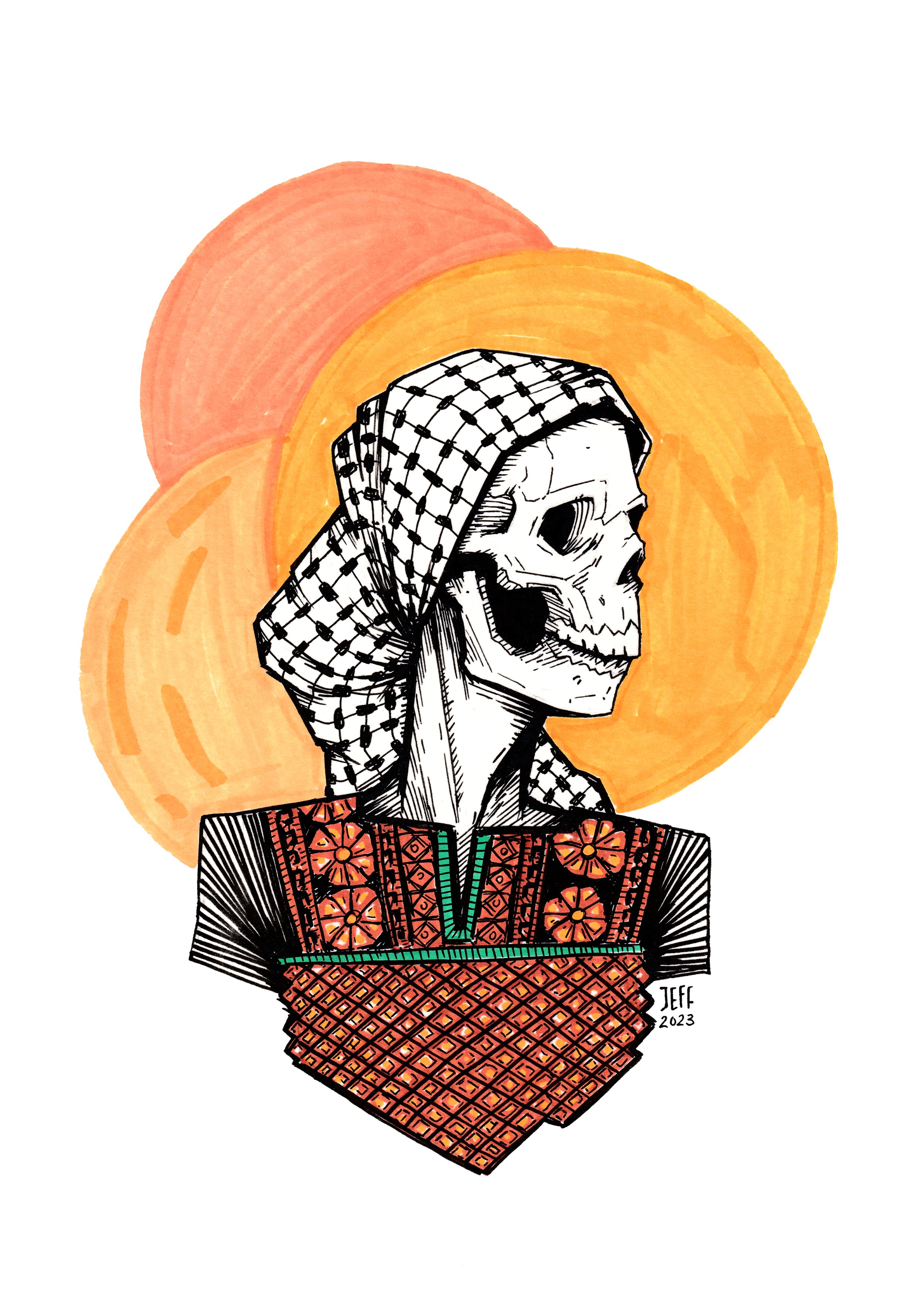 Genocide - Ink & Markers - By late October it was clear things were going to get much worse. This was Genocide clear as day and livestreamed in 4k. How do I even express this? I don’t want the skull to symbolize some kind of surrender to the idea that we should just watch as this happens. I tried to capture Palestinian embroidery in folk dress as best as I could to celebrate Palestinian culture and life.